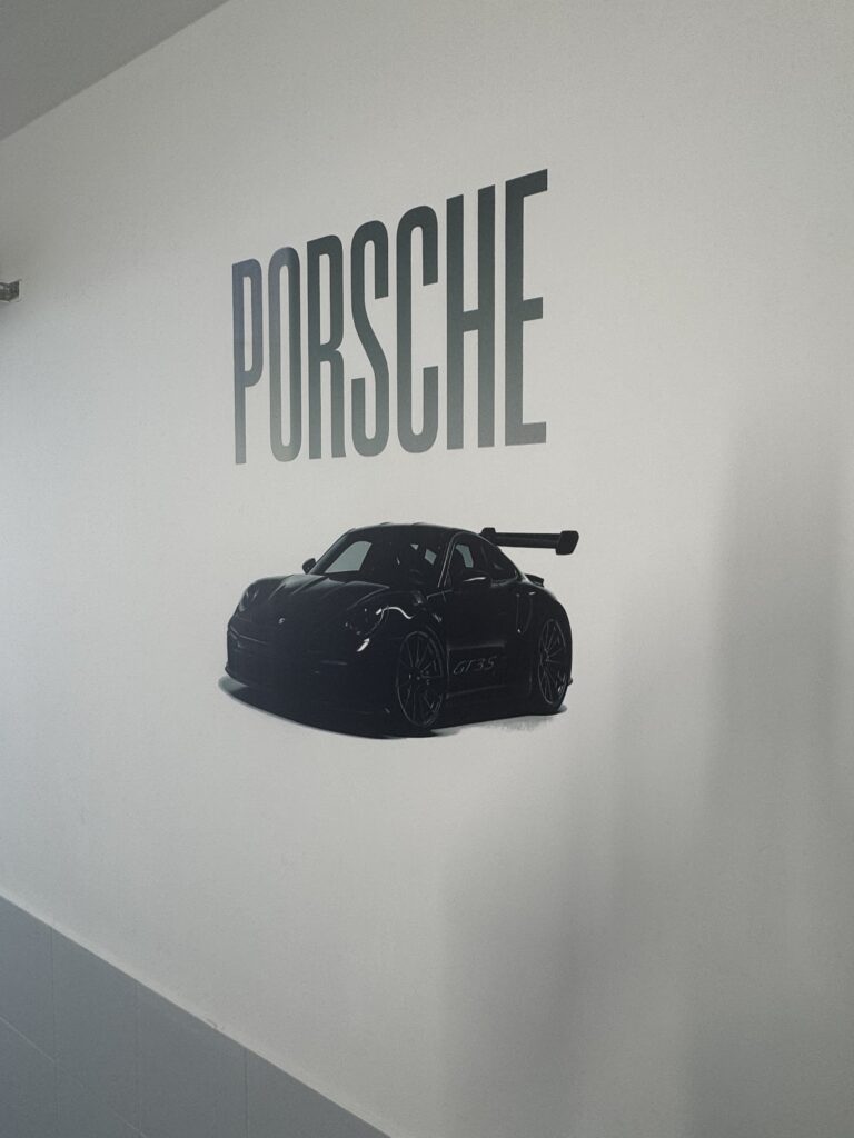 Na ciemniejszych ścianach stosujemy biały poddruk, dzięki czemu kolory pozostają intensywne i czytelne – wtedy koszt od 500 zł/m².